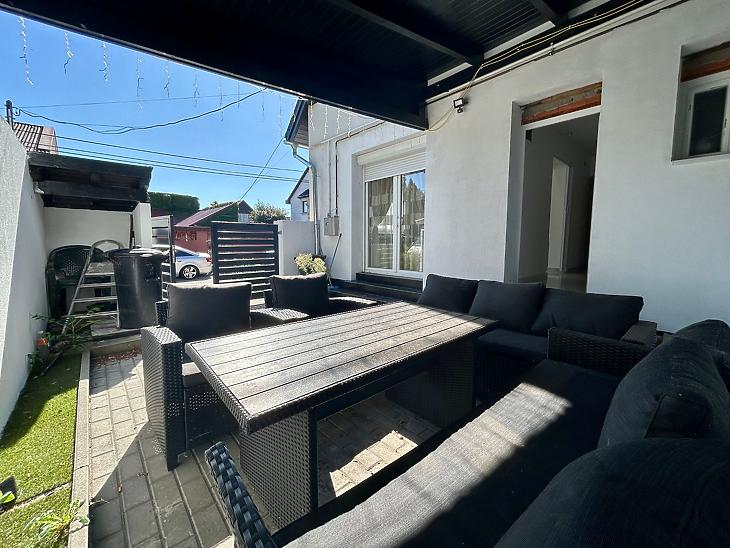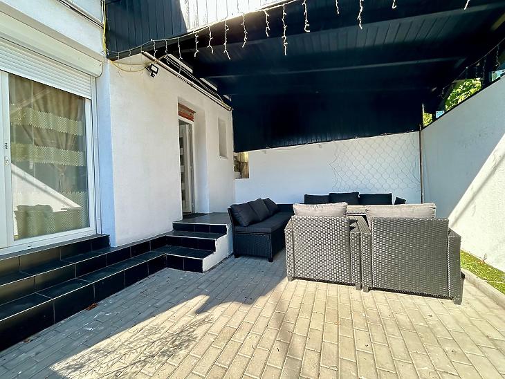 Az ingatlan utcafrontról külön kapun közelíthető meg, a lakás bejárata egy 24 nm nagyságú térkővel burkolt telekrészről van, ami igény szerint kocsibeállóként is használható.