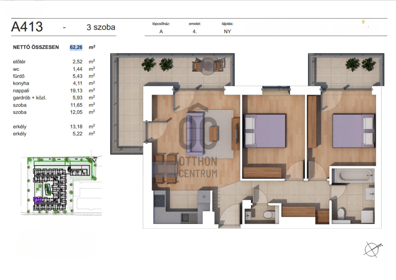 Nettó alapterület: 62,26 m2 + 5,22 m2 erkély + 13, 18 m2 erkély.Projekt bemutatása