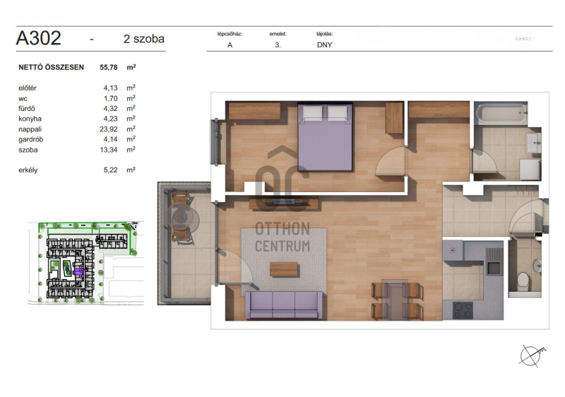 Nettó alapterület: 55,78 m2 + 5,22 m2 erkély.