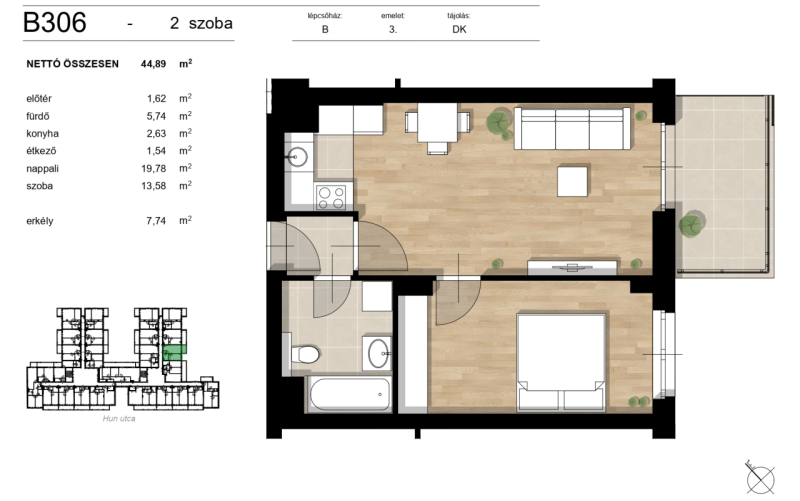 Budapest XIII. kerületében a Hun utcában, új építésű társasházban eladásra kínálok harmadik emeleti, 45 nm-es lakást, 8 nm-es erkéllyel.