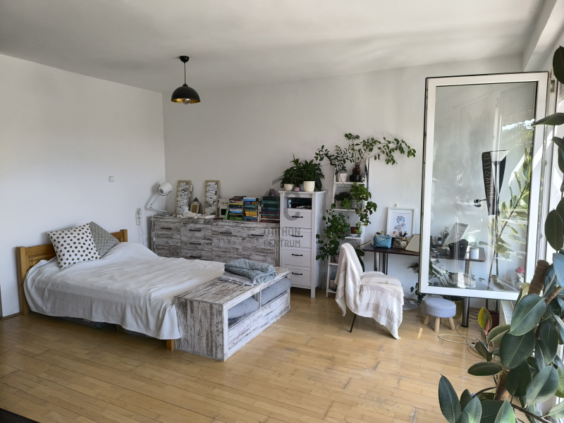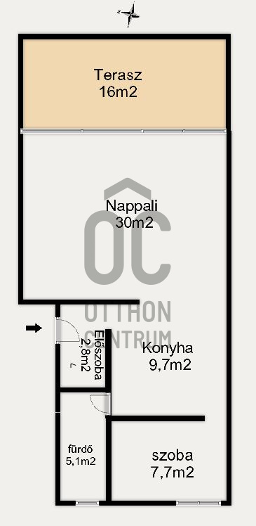 A lakás második emeleti 56 m2, 1+1 szobás bútorozott tégla 16 m2 -es terasszal.