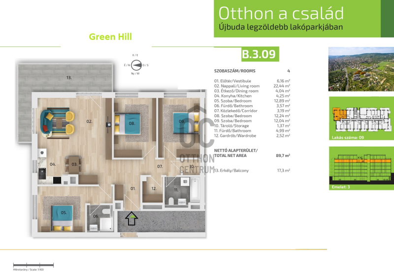 Lakás nettó alapterülete 89,36 nm + 16,59 nm terasz.