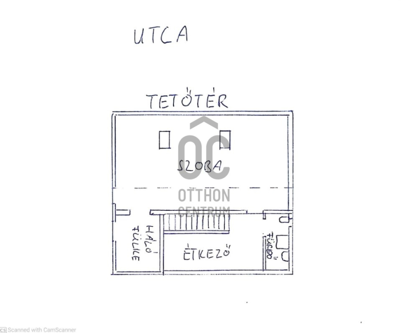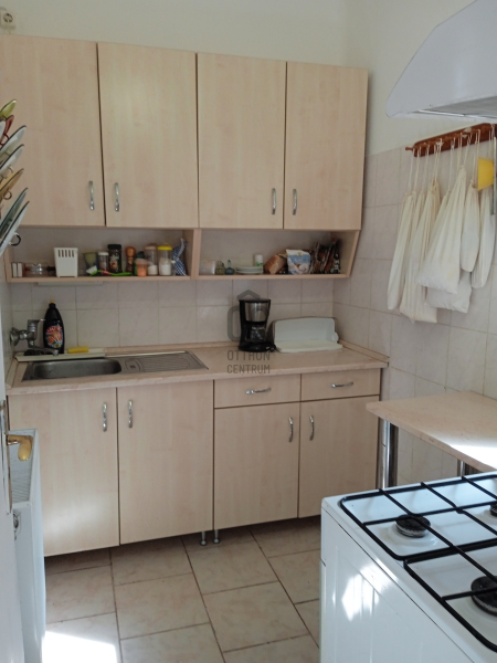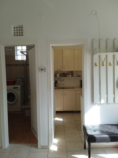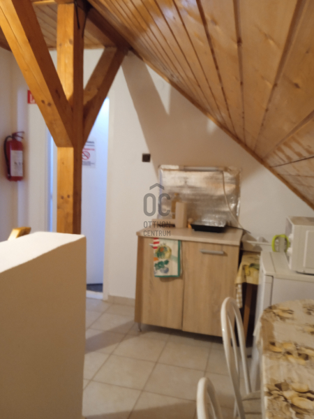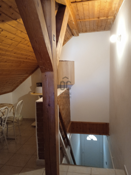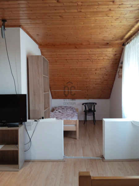 Felső szint 40 nm egylégteres szoba kis hálófülkével, előtérben főzősarok, zuhanyzó wc-vel.