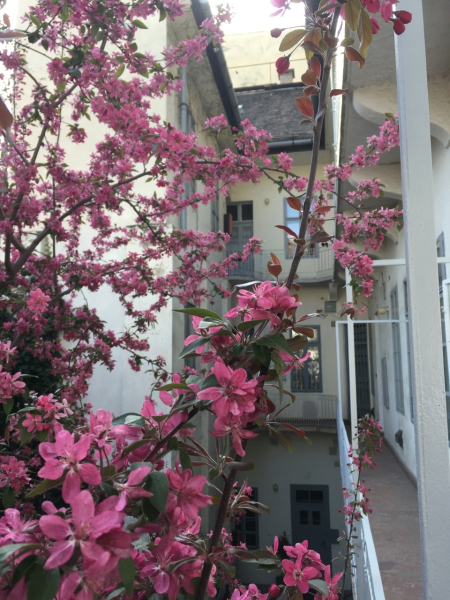 A társasház mindössze két szintes, rendezett és nyugodt, belső kertje zöld...