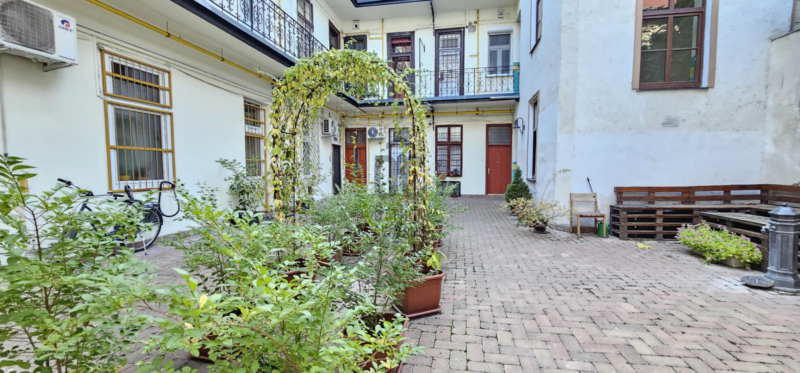 A térkövezett közös udvarról van a lakás bejárata.
