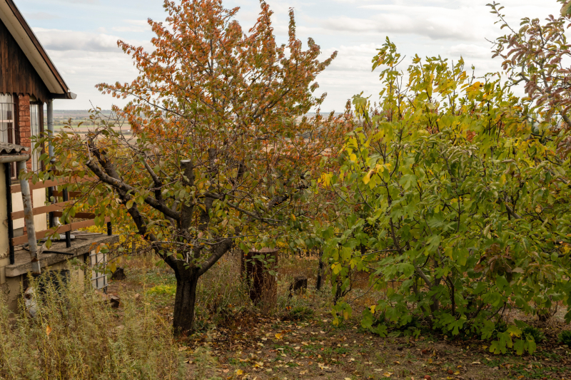 Rákanyarodunk a szőlőhegyre vivő útra, és megyünk. Eleinte aszfalt, megyünk felfelé, kétoldalt szőlők, kertek, házikók, aztán az út zúzott kövesre vált, közeleg a dombtető, ahol már az erdő az úr, de még előtte jobbra kanyarodunk és megékezünk a nyeles telekként működő kis birtokra. Gondozott