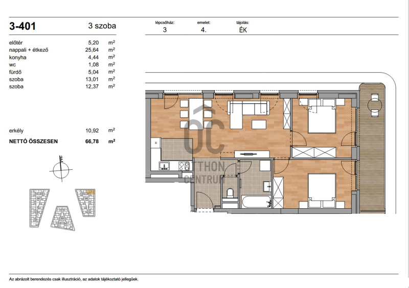 Az ingatlan nettó alapterülete 66,78 m² + 10,92 m² erkély.