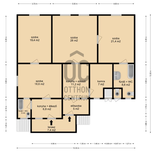 - Nettó 130 m2-en, 4 szoba, 2 fürdőszoba + WC, 2 konyha, kamra és különálló WC található.