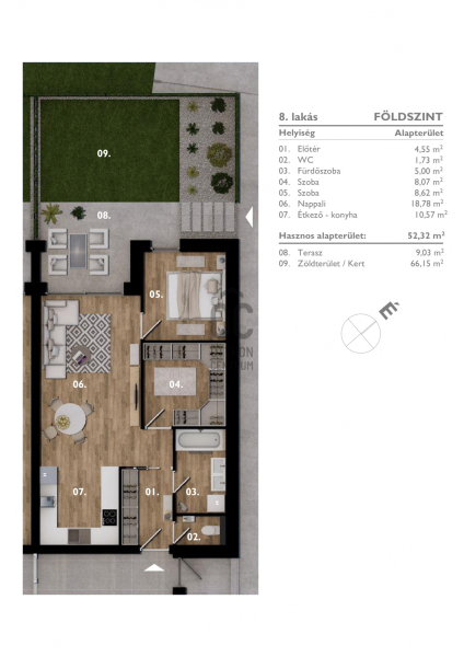 - a földszinti, 52,32 nm ingatlanhoz külön terasz és kert tartozik