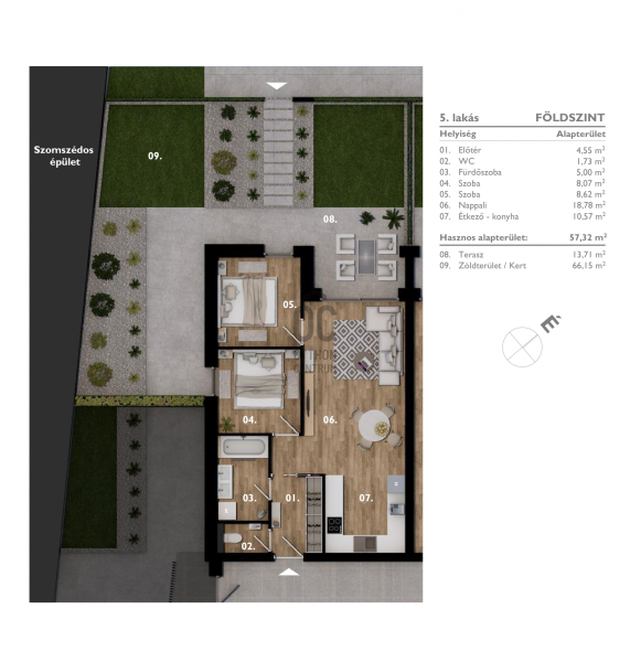 - a földszinti, 57,32 nm ingatlanhoz külön terasz és kert tartozik