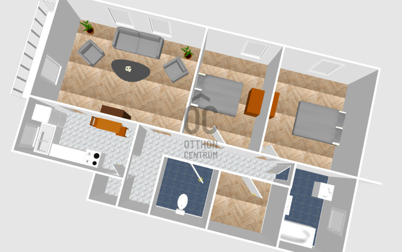 - Ideális elrendezésű, 2 szoba + nappali, gardrób szoba, külön konyha, háztartási helyiség