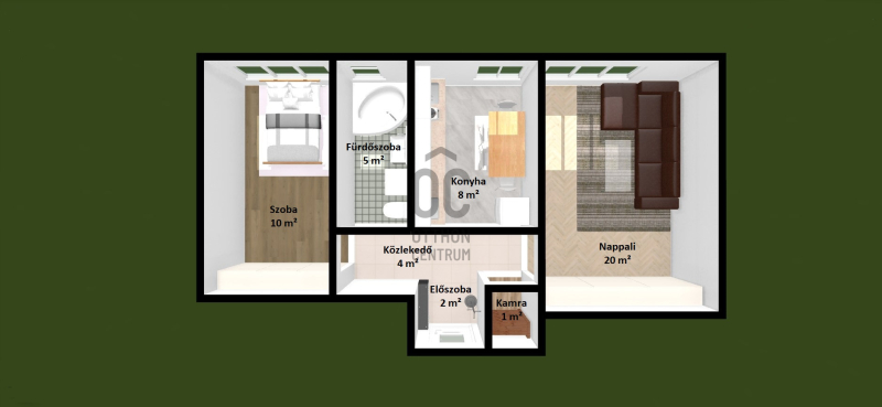 - 2 szobás (1 hálószoba és 1 nappali)