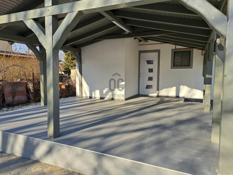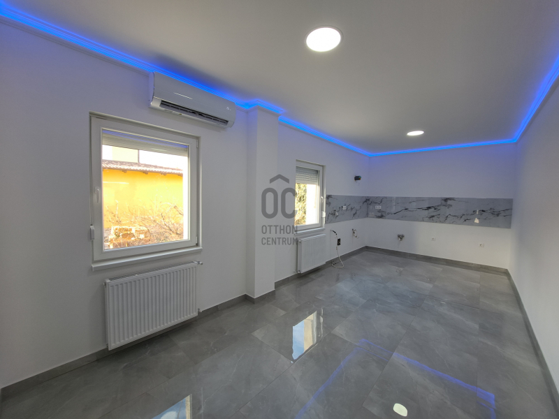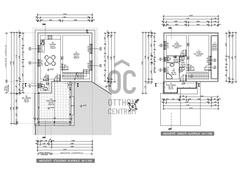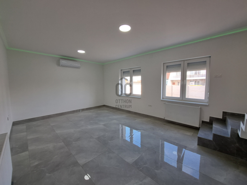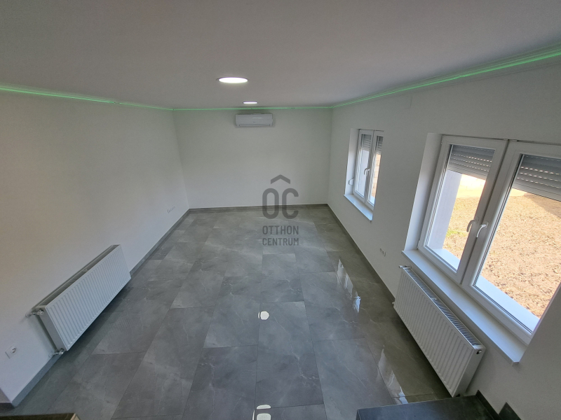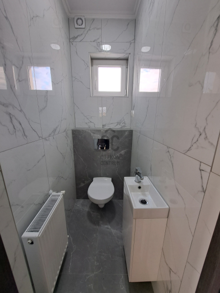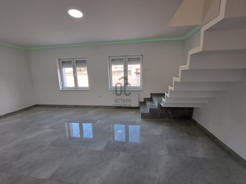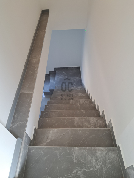 Földszintre a 25,6 nm-s teraszról jutunk be, ahol 19,5 nm-s konyha+étkező, Wc kézmosóval, 26 nm-s nappali, melyből lépcső vezet az emeleti részre.