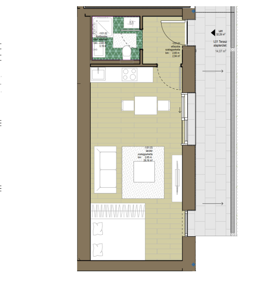 Kis lakás akár nappali+hálófülkével a kertszinten!Lakás mérete: 32,29 m2 + terasz 14,07 m2
