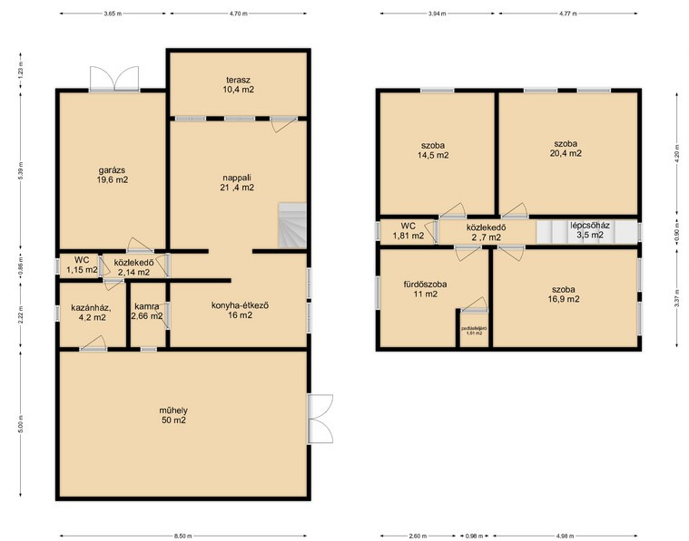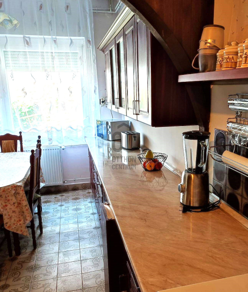 - Nettó alapterülete 125 m2, az aló szinten nappali, konyha-étkezővel, kamra, WC, kazánház került kialakításra. Az emeleten három hálószoba, fürdő, WC található.