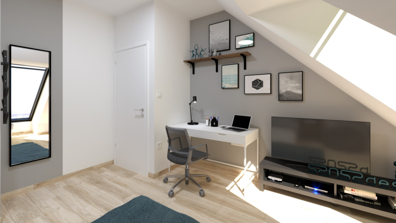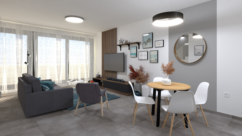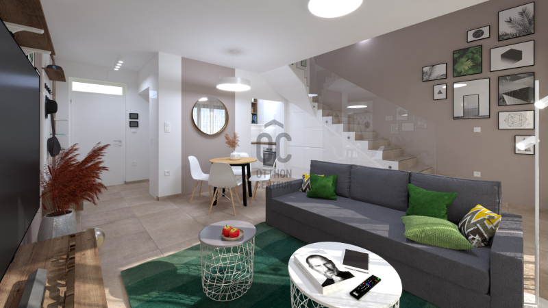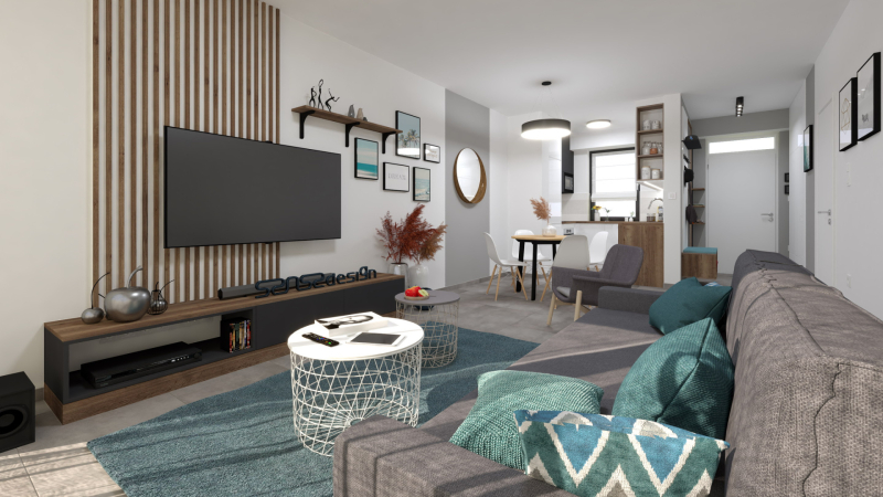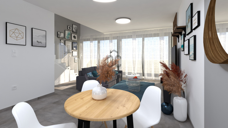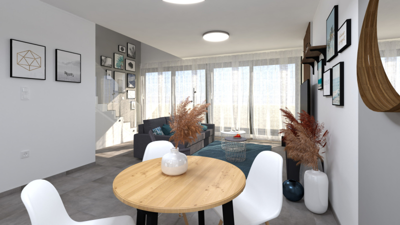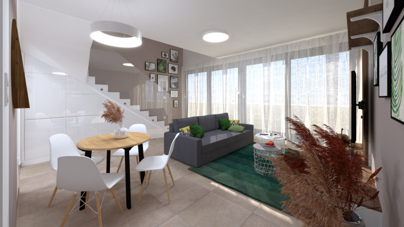 A kétszintes lakások alsó szintjén találhatóak a közösségi területek (konyha-...