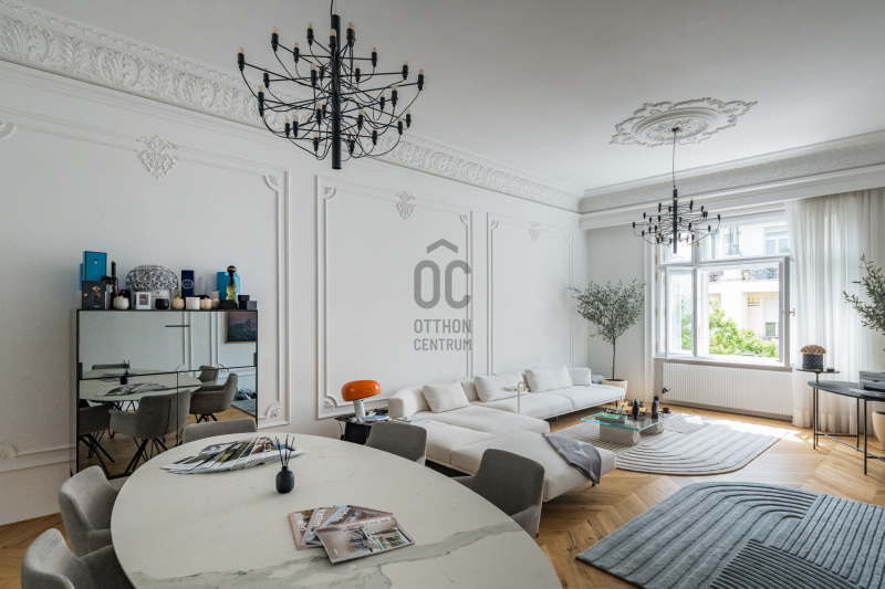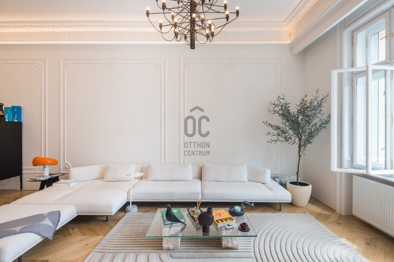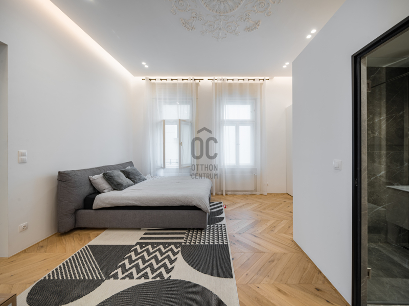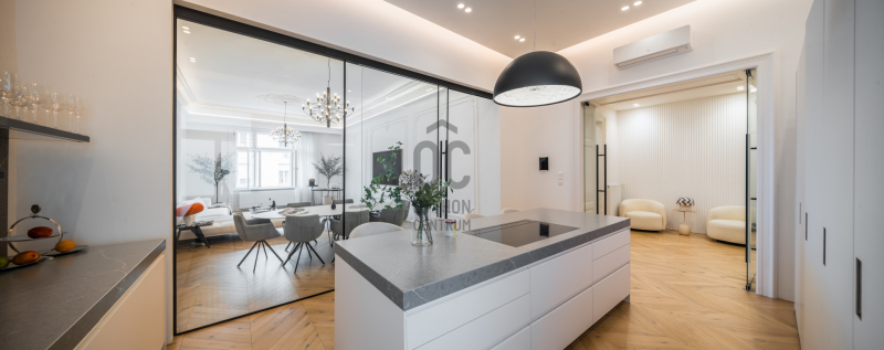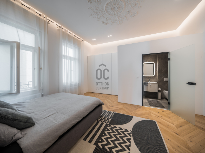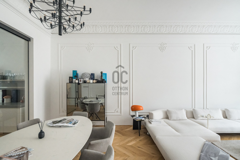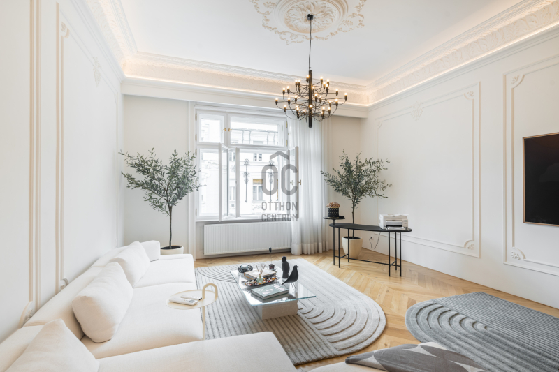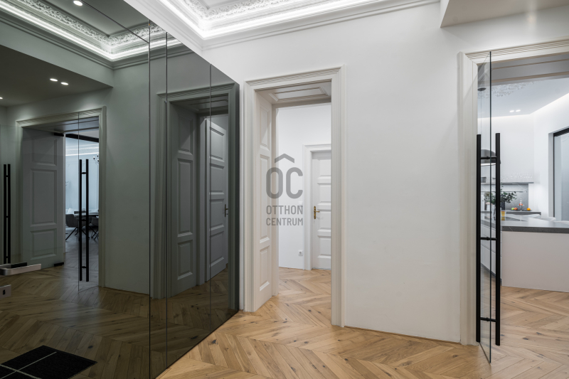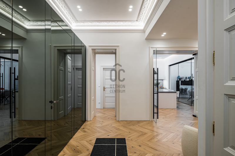 Az V.kerületben, a város szívében vagyunk: Szabadság tér, Honvéd tér és a Parlament közelében. A több, mint 200 m2-es ingatlan a modern stílust képviseli. A belsőépítészeti kialakítást az újonnan megtervezett építészeti elemek inspirálták. A modern irányt kiegészíti pár klasszikusabb díszítő elem, mint a fali stukkó. A díszítőelemek gyönyörű m...