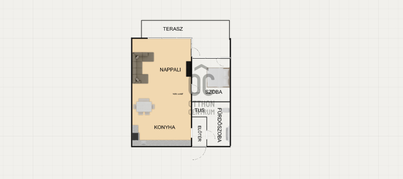 - Elrendezés : nappali + konyha + étkező , hálószoba , fürdőszoba tusolóval , W.C., előtér