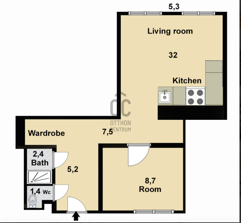 FELÚJÍTOTT konyha és nappali amelyből nyílik egy hálószoba, 1 db fürdőszoba és egy előszobából áll az ingatlan.