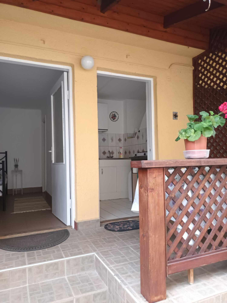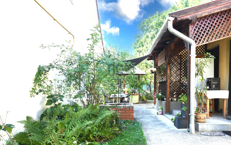 Az utcáról belépve egy gondozott kert ...