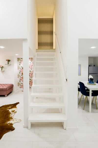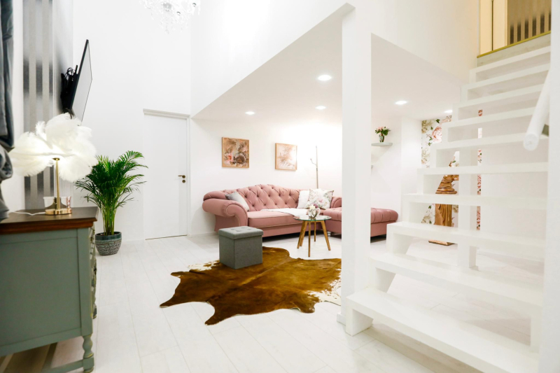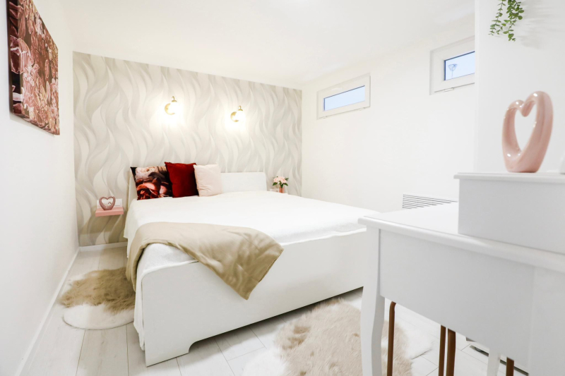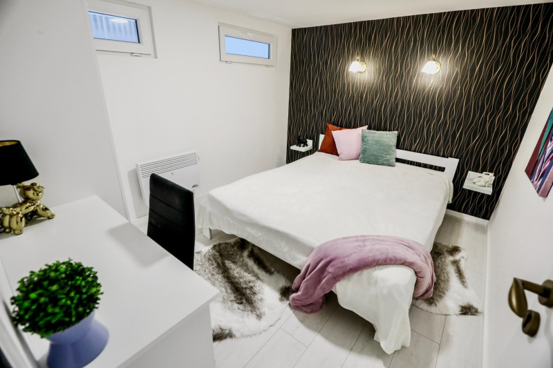 Az alsó szinten egy tágas nappali, modern konyha és fürdőszoba található, míg a felső szinten két helyiség áll rendelkezésre.