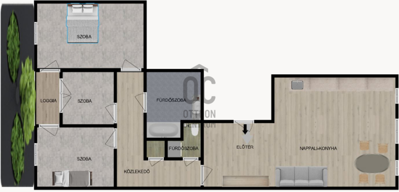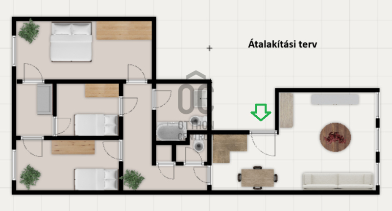 - Konyha-étkező + 3 szoba, gardrób