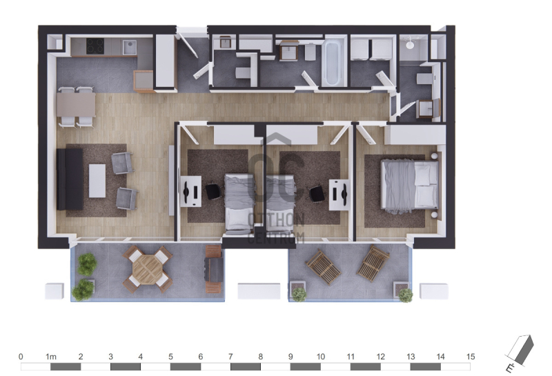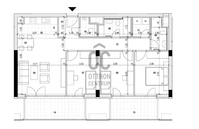 Ez a lakás az utca irányába néz, DK-i tájolású. 2 db terasza van, háztartási helyiséggel, 2 db fürdőszobával rendelkezik.Projekt bemutatása