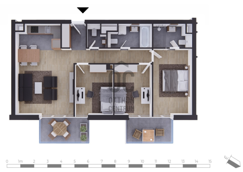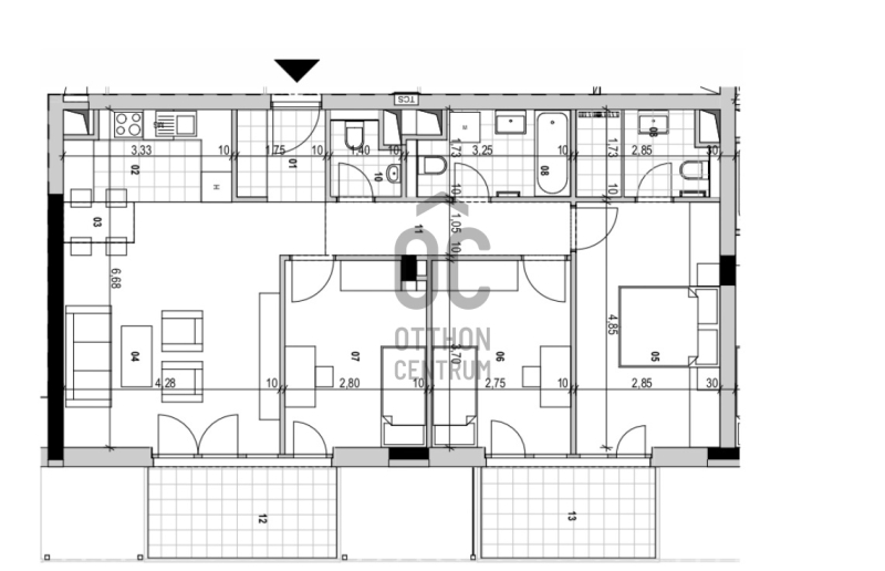 Ez a lakás mellékutcára néz ÉK-i tájolású. Minden szobája külön nyílik. 2 terasza és 2 fürdőszobája van.Projekt bemutatása