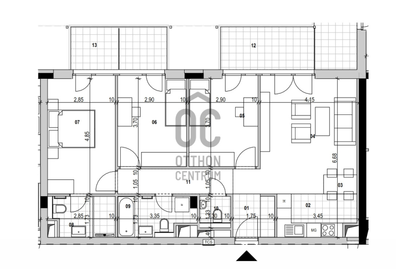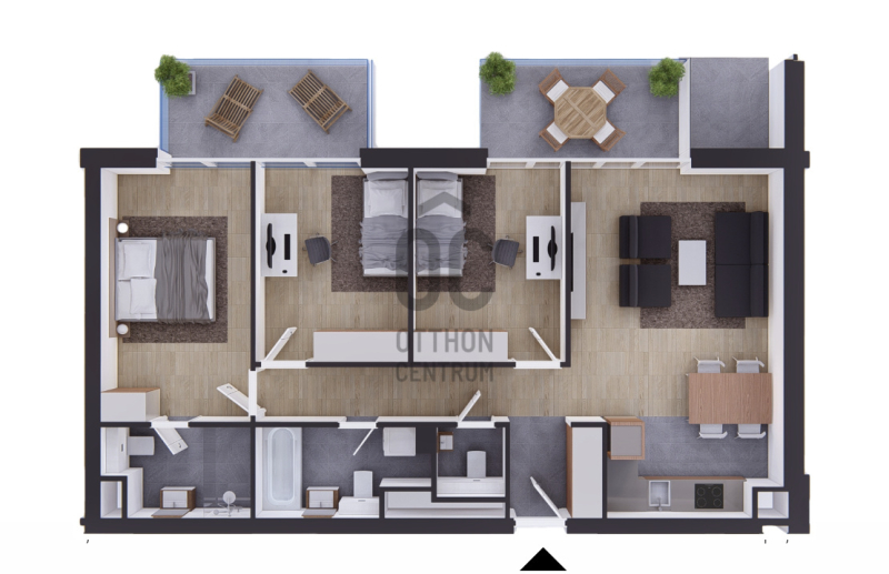 Ez a lakás zöld belső kertre néz, ÉNY-i tájolású, 2 terasza van, 2 fürdőszobával
