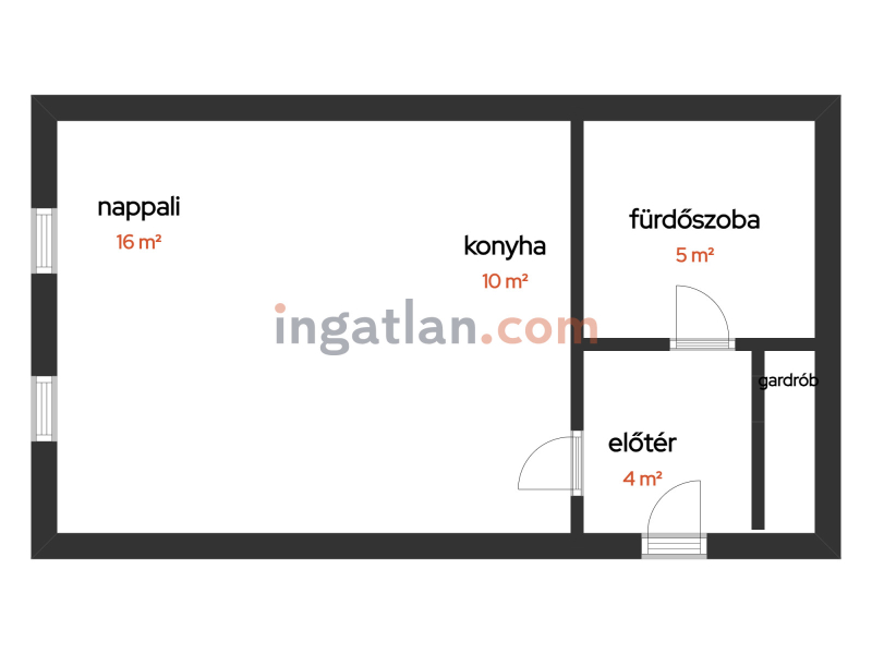 3.) elosztása: előtér, 16 nm-es szoba egy légtérben a 10 nm-es konyhával, fürdő