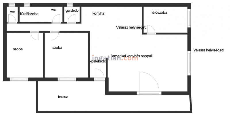 Az ingatlanban három külön bejáratú szoba, amerikai konyhás étkezős nappali, kamra, wc, kádas fürdőszoba, előszoba és egy 8.15 nm-es terasz található.