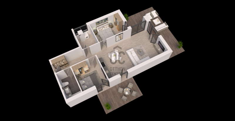 A lakás földszinti, nettó 82,09 nm, nappali+ 2 szobás. Tartozik hozzá 42 nm terasz, és 145 nm saját használatú kert.Projekt bemutatása