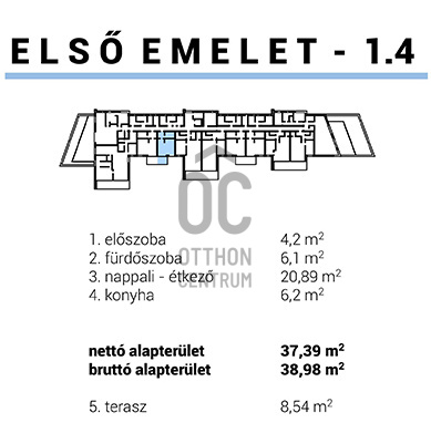 A nettó 37,39 m2-es apartman elosztása:előszoba: 4,2 m2
