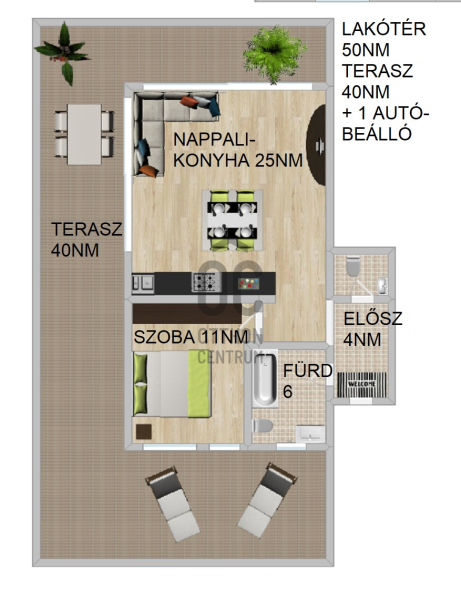 - 50 nm lakótér amerikai konyhás nappali + 1 szoba
