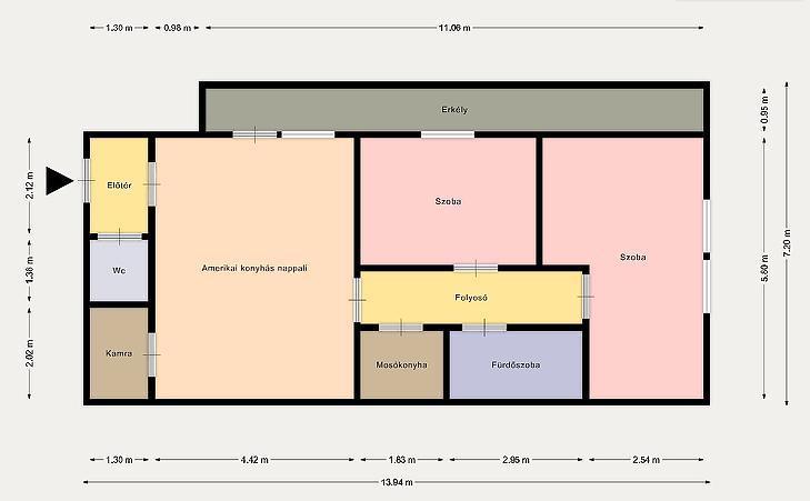 Elrendezése szerint 2 szoba, amerikai konyhás nappali, fürdőszoba mellékhelyiséggel, külön wc, kamra