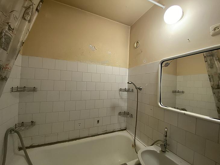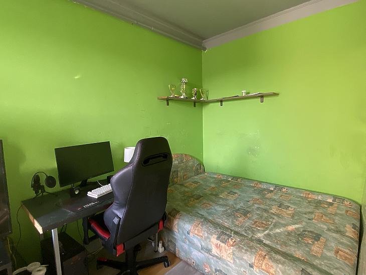 A szobák laminált parkettásak, a vizeshelyiségek és a közlekedő linóleumos, a konyha pedig járólapos.