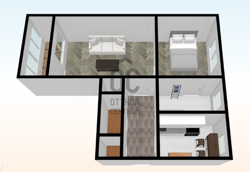 A szobákon kívül, a 54 m2-en a lakás magában foglal egy tágas előszoba-közlekedőt, egy tárolót, egy kamrát, egy ...