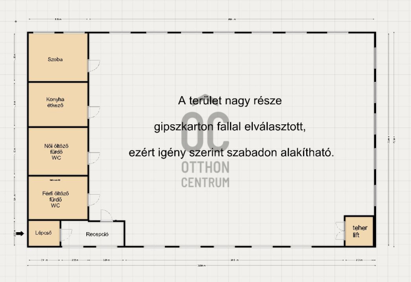 Tartalmazza recepció, öltözők, mosdók-zuhanyzók, konyha, irodák, raktárak, üzemrész munkaterületeket.