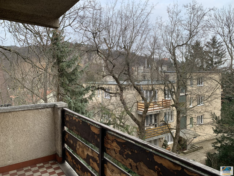 Egy gyönyörű, zöld panorámára néző 6m2-es, élhető erkély nyílik a világos nappaliból.