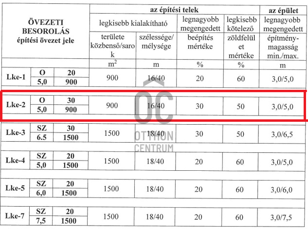 Az Lke-2 jelű lakóövezet beépíthetőségére vonatkozó adatok: