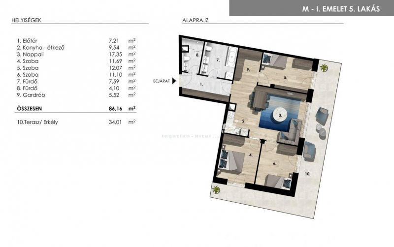 A kínált lakás I. emeleti, egyedi kialakítású 86,16 nm-es nagy teraszos (34,01 nm).Helyiségek: előtér, konyha - nappali,...
