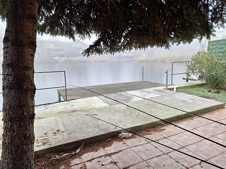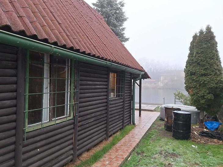 A telek füvesített, rendben tartott. A fedett terasz a tó felé néz, és a horgász stég belóg a tó