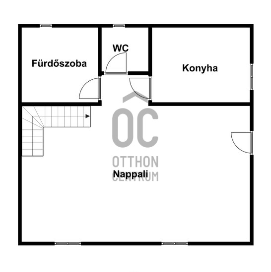 Alsó szinten: nappali, konyha, fürdőszoba, külön WC található.