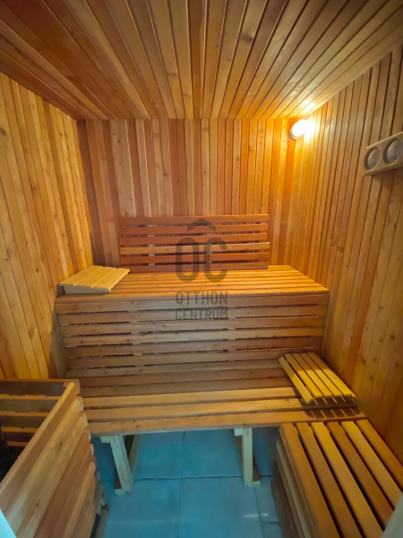 Az alsó szinten található egy vendégszoba, fürdő, szauna, pihenő.