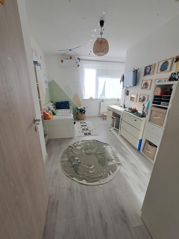 Elosztás: Előszoba, három hálószoba, fürdőszoba wc-vel külön helyiségben, amerikai konyhás nappali , 10m2-es erkély.