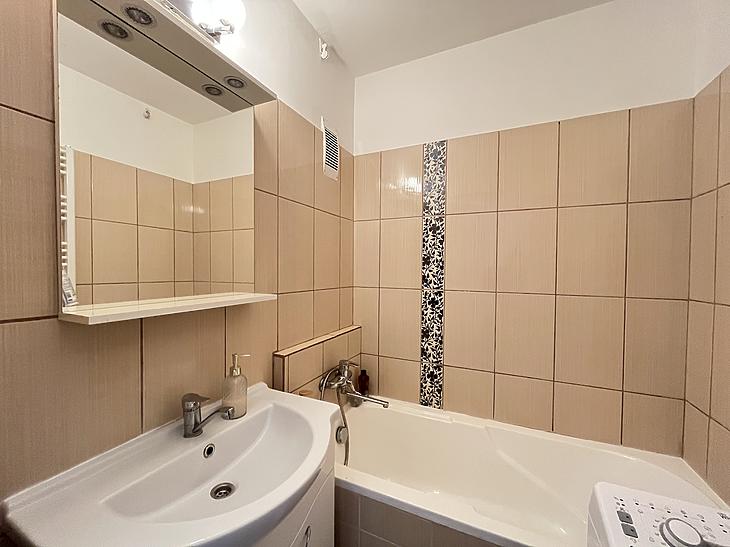 Az akrilkádas fürdőszoba burkolata új, a mosógép ebben a helyiségben kapott ki és beállást. A wc külön helyiségben van.