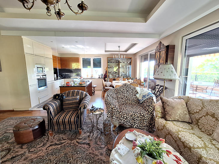 Kényelmes és fényes amerikai konyhás nappali ahol egy gyönyörű kilátással élvezhetik az étkezéseket.