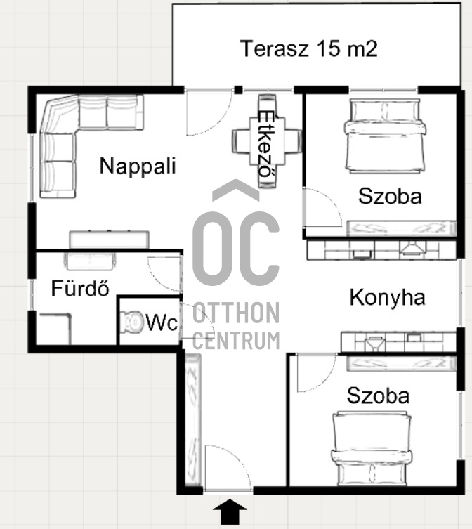 Helyiségei : nappali - étkező, konyha, 2 szoba, külön fürdő, wc, közlekedő és a terasz.