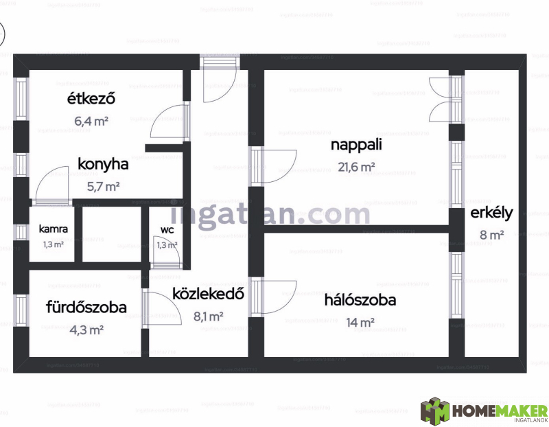 - minden helyiség a közlekedőből nyílik