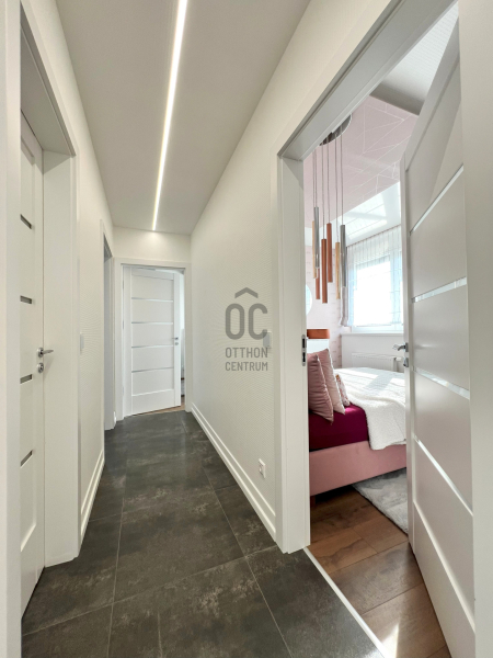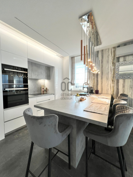 Az ingatlan nettó 84nm alapterületű. Helyiségei: előszoba, nappali-konyha-étkező, 3 hálószoba, 2 fürdőszoba-WC, külön WC. A nappaliból kijuthatunk a 16nm-es teraszra, ahonnan dunai panoráma tárul elénk. Az ingatlan magas minőségű bútor...